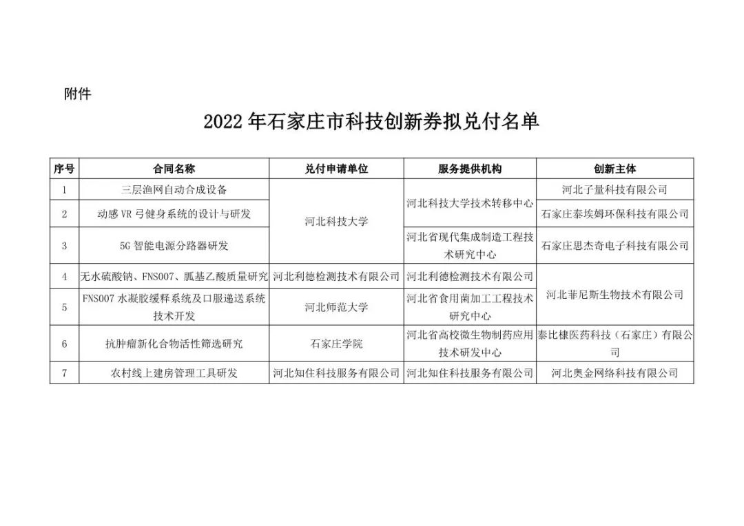 2022年石家莊市科技創(chuàng)新券擬兌付資金公示根據(jù)石家莊市科技局、市財(cái)政局印發(fā)的《石家莊市科技創(chuàng)新券實(shí)施細(xì)則(試行)》(石科規(guī)〔2018〕2號(hào)